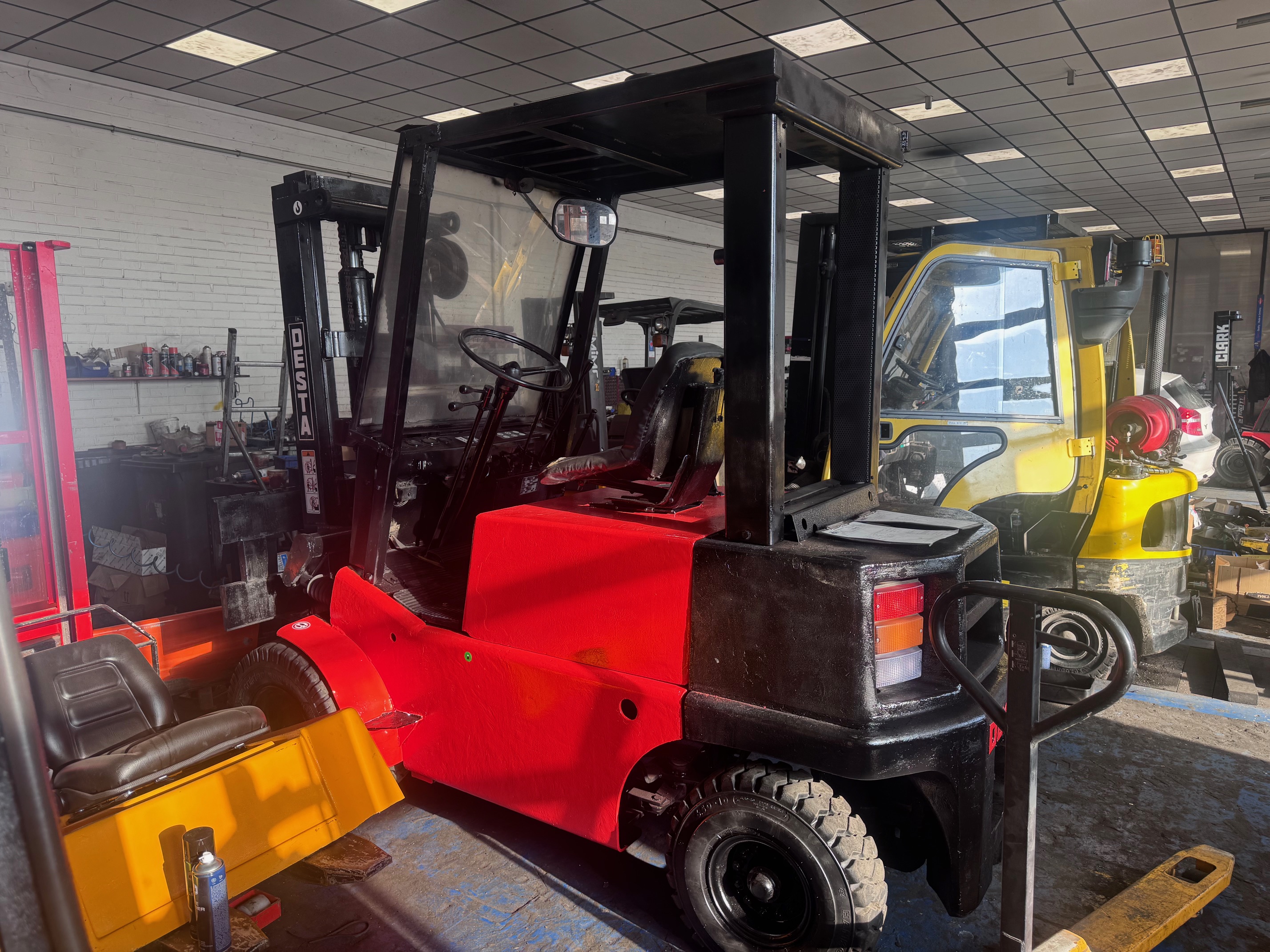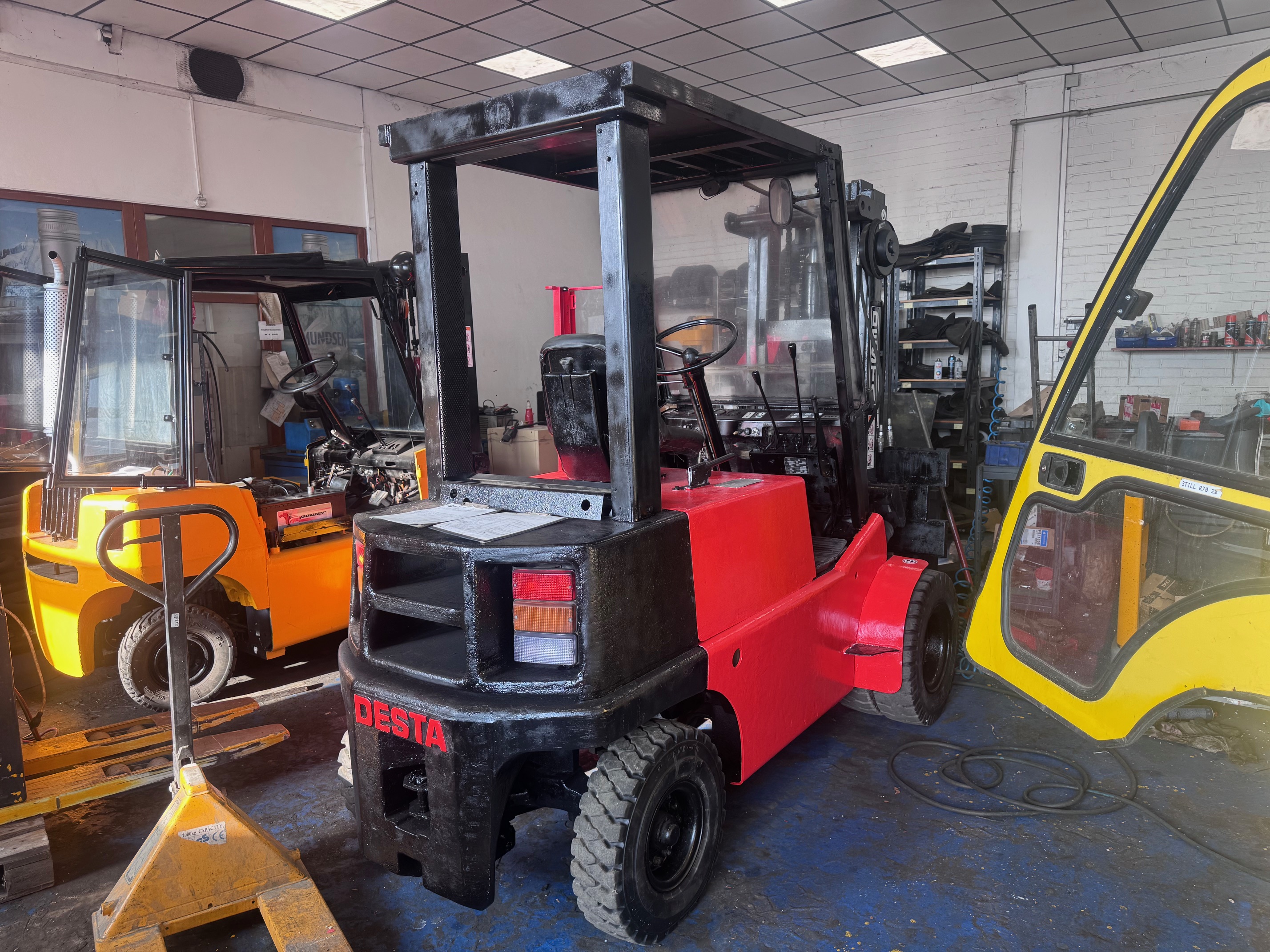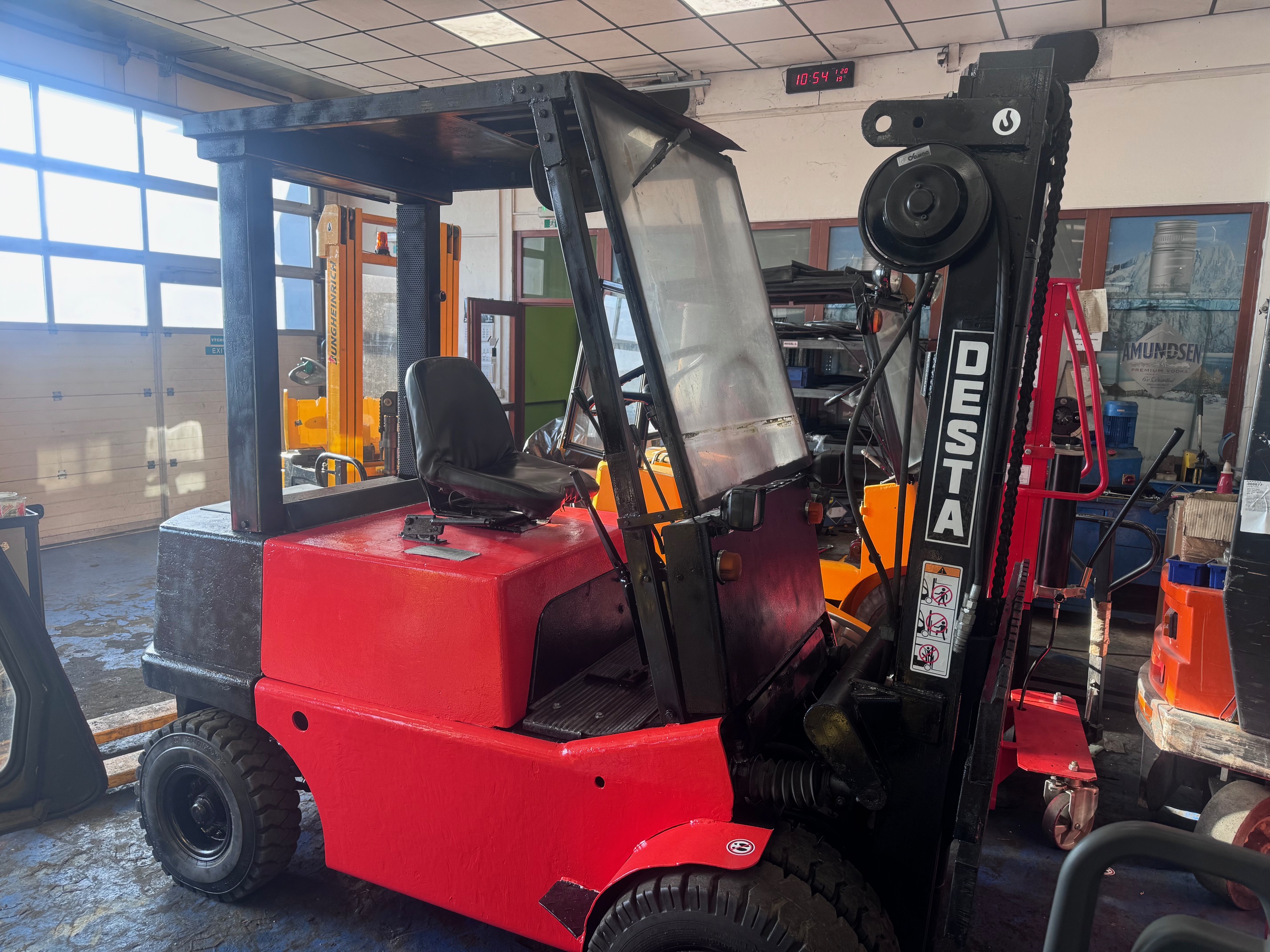 Prodám VZV Desta DV35A, diesel, nosnost 3500kg, 2montáž, uzávěrka diferenciálu, pohon Diesel, zdvih 3300 mm, motor ZETOR, průjezdný výška 2340mm, pneu vzdušnicové (dá se předělat za plné, mám starší), polokabina, po celkové údržbě a drobných opravách, řídící náprava, silembloky, matesy-pružné závěsy, oleje filtry, nový lak, nové palivové filtry, atd... pracovní i silniční osvětlení přední i zadní, dá se dodělat boční posuv vidlic cca za 12000,-vč nového posuvu a montáže, cena je bez DPH.